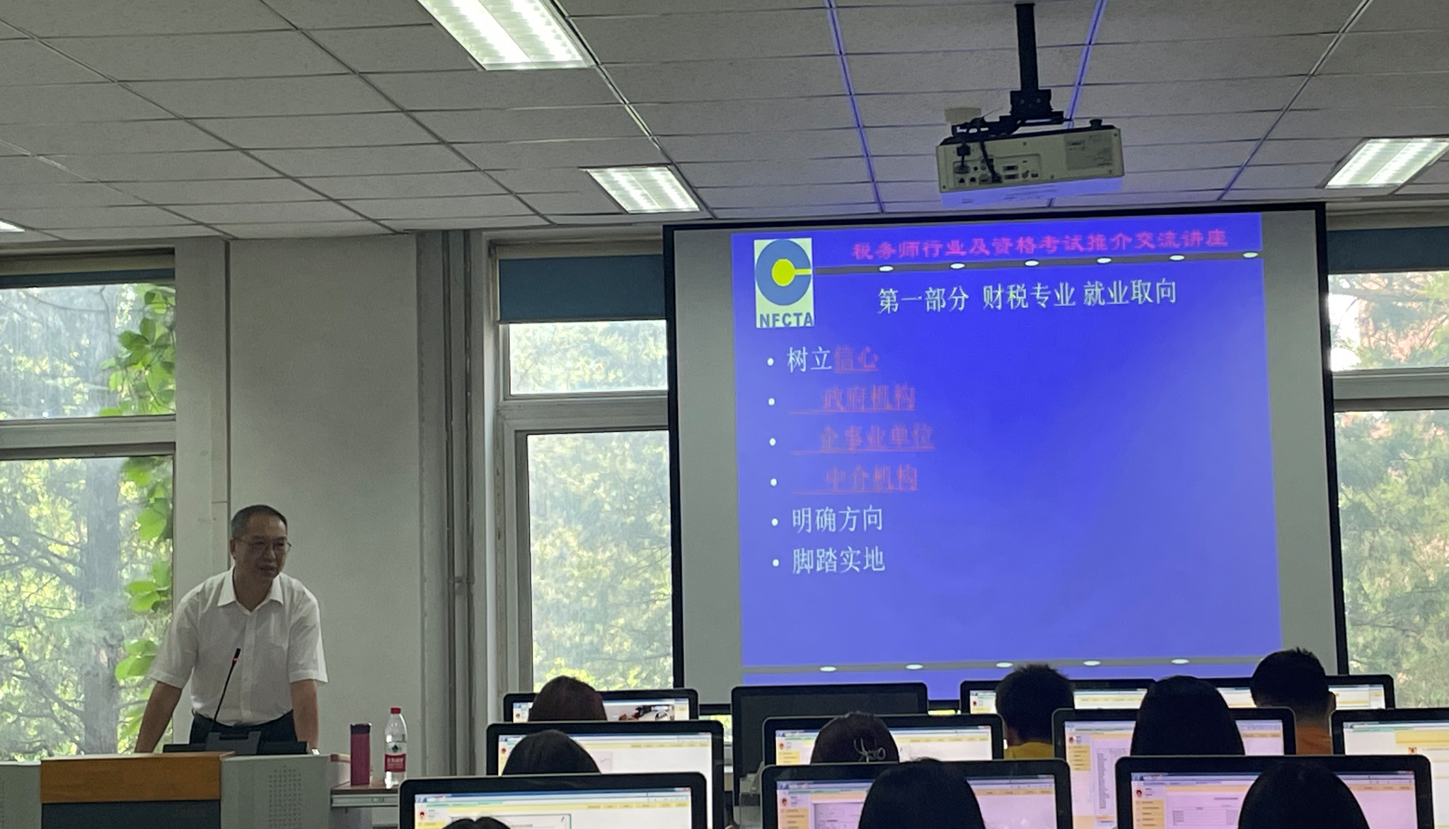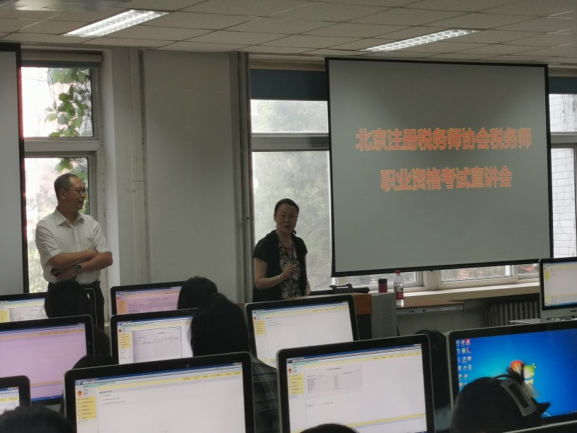 首先,学院副院长刘笑冰介绍与会嘉宾和此次宣讲会的重要意义并致欢迎词。其后,郑东霞秘书长介绍了北京注册税务师协会是当前涉税专业服务的主力军,共有600余所税务所和5300余名从业税务师。她指出,会计学大三学生具有备考税务师得天独厚的优势,也是最佳的学习时机,并鼓励在场学生在毕业前多考证书,助力未来就业。接下来,会计系主任张宁老师对长期合作的校级人才培养基地北京鑫税广通税务师事务所进行了介绍。王进董事长为在场会计专业学生注册税务师行业的历史起源和发展脉络,讲解了税务会计师的从业范畴和就业方向,极大地激发了同学们对税务师职业的从业热情。最后,业务培训部邢帮杰主任介绍了税务师职业资格考试相关事项,对报名时间、程序、费用和方法等进行了详细的介绍和悉心的指导。在场同学纷纷记录学习,表现出了浓厚的兴趣。