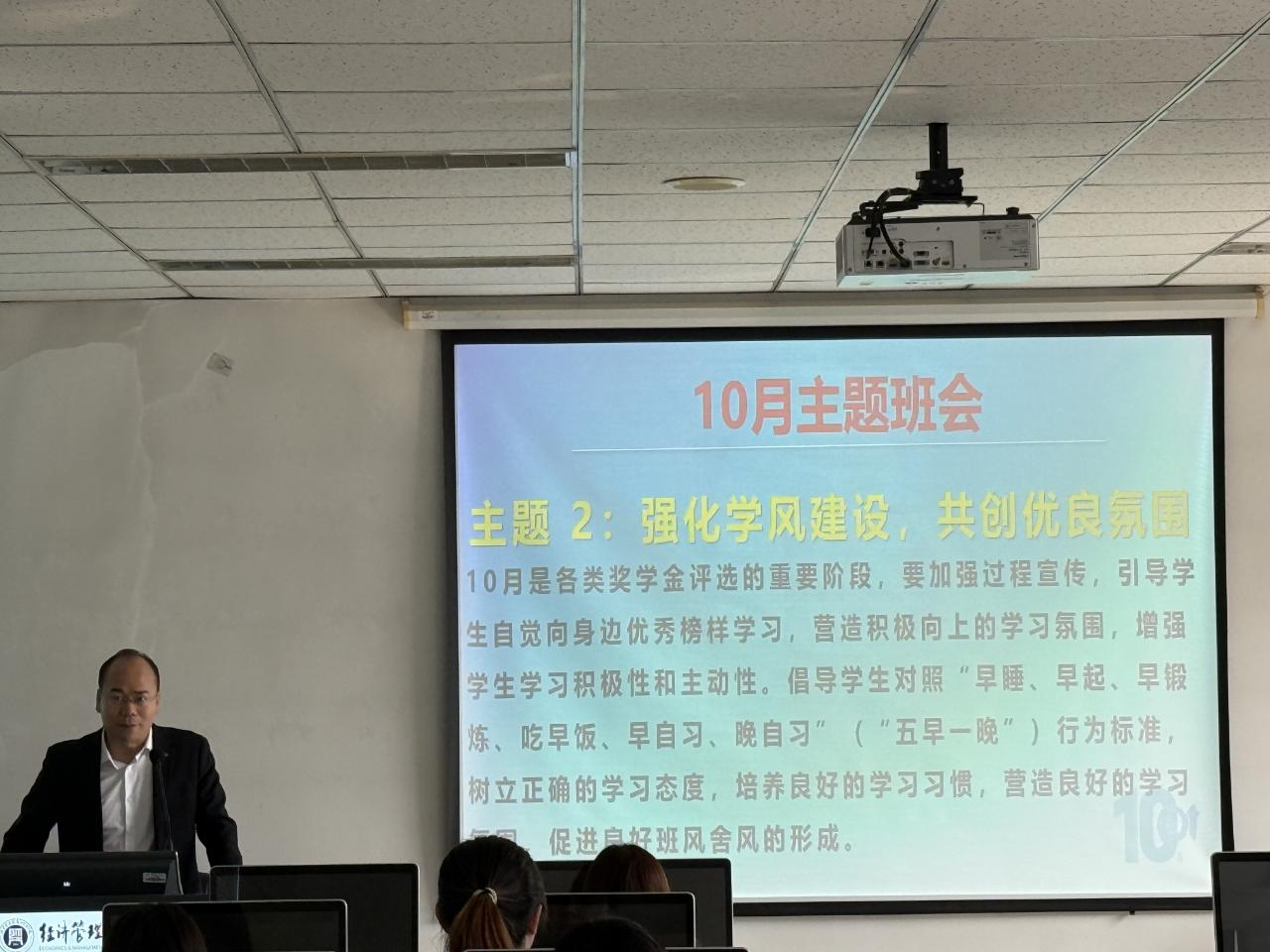 结合10月奖学金测评工作,通过文件解读、优秀学生经验分享等多种形式,加强宣传引导,增强学生学习自觉性与主动性,积极营造奋发向上的学习氛围。同时积极引导学生开展“早睡、早起、早锻炼、吃早饭、早自习、晚自习”(“五早一晚”)活动,端正学习态度,培养良好学习习惯,明确学习目标、优化学习方法,推动形成勤学笃行的优良学风。