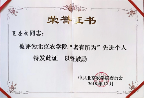 2018年 夏奎武老师被评为yl23411永利“老有所为”先进个人