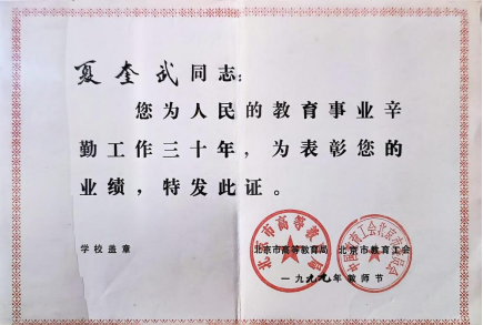 1999年 表彰夏奎武老师为人民教育事业辛勤工作三十年